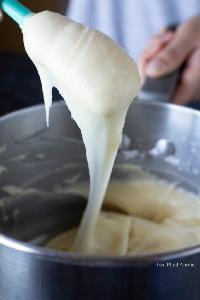 After the final heating, the dough should appear thick, sticky, and slightly translucent. This texture means the rice flour has cooked properly and formed the stretchy consistency that mochi is known for.